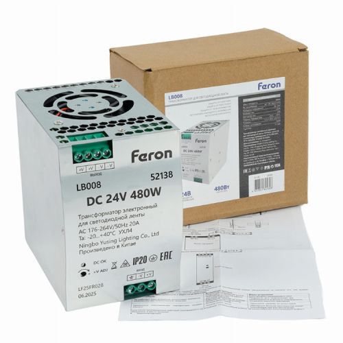 Трансформатор электронный для светодиодной ленты и оборудования на DIN-рейку 480Вт 24В 63*125.5*113мм IP20 LB008 52138 (Код товара 52138)